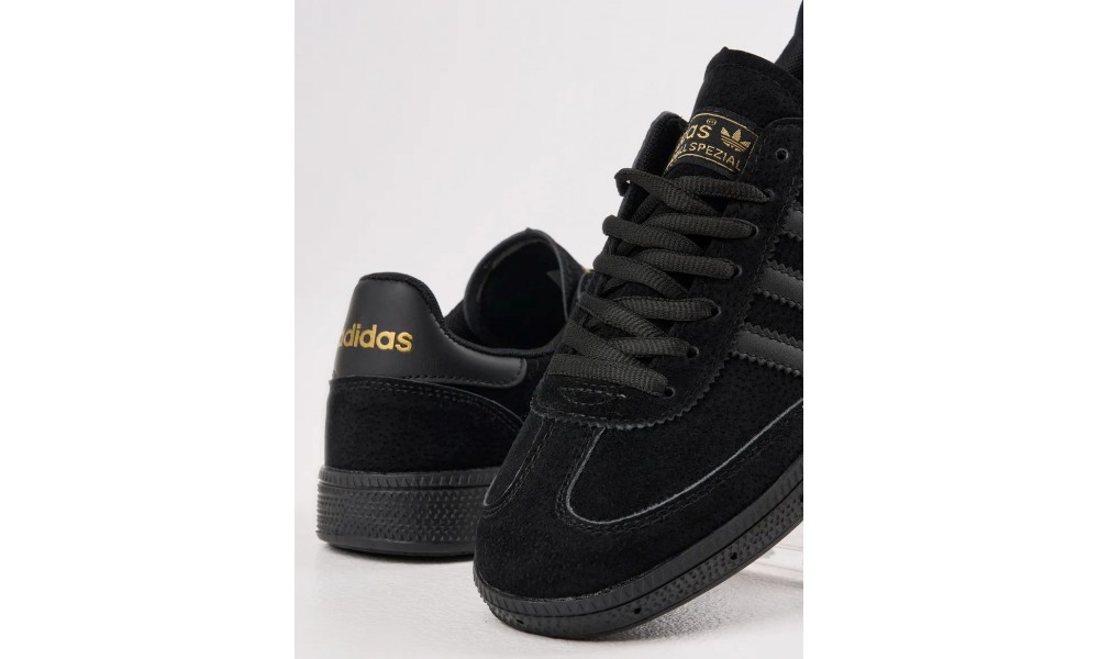- Логотип: три полоски, трилистник Adidas, золотистая надпись Spezial